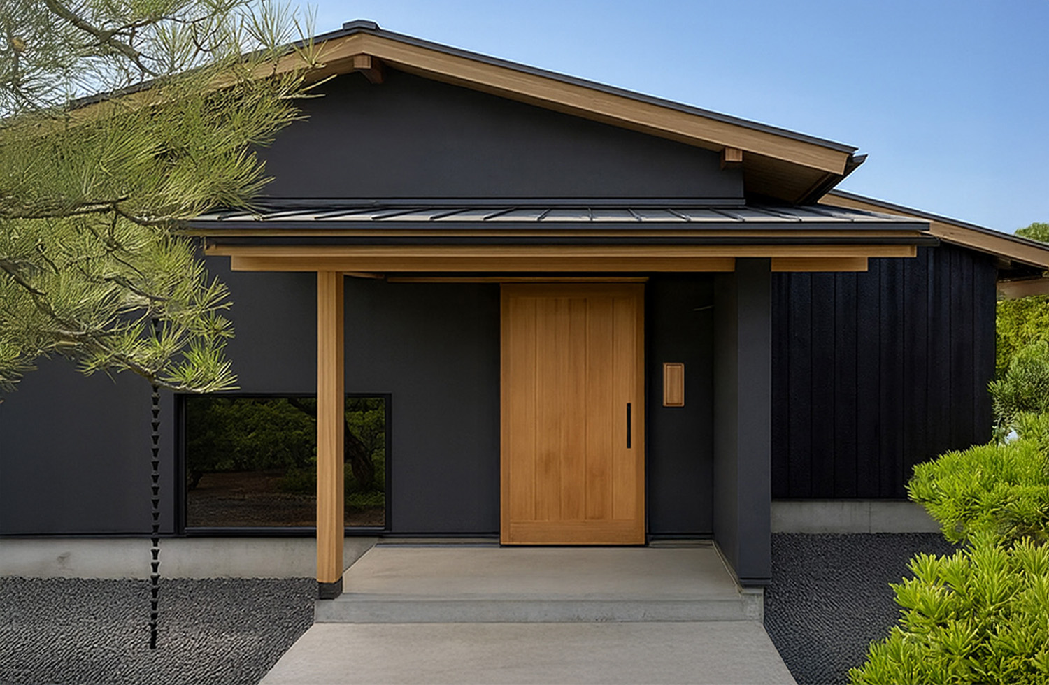 塗り壁と焼杉を組み合わせた上品な外壁に、植栽の緑が調和する佇まいは、三方道路からの眺めも美しく、四季の移ろいを感じられます。玄関土間は、腰をかけて話せる高さに配慮。土間からお座敷やホールへ直接上がれる動線や、襖でLDKを仕切って来客を迎えられる工夫など、茶道を嗜まれていた奥様ならではの心づかいが込められています。キッチンはI型と家電カウンターを組み合わせたL型配置。中央の作業カウンターで囲うように設け、家事動線を効率的にしました。3帖の廊下を中心に、居室や洗面、収納へのアクセスできる動線に、光や風が通り抜け、お庭とのつながりも感じられます。ご主人の部屋には外へ出られる扉を設け、作業着や靴を置けるスペースも確保。DIYや外作業を楽しめる空間となっています。