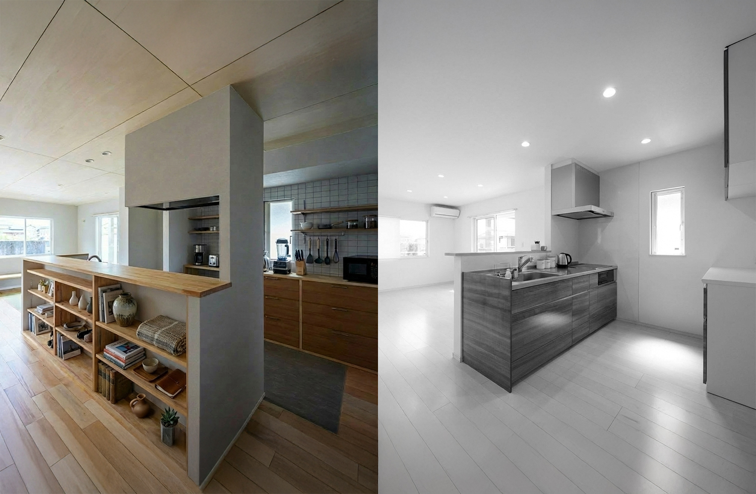 浴室から洗面所、サンルーム、勝手口、ウォークインクローゼットへとつながる動線を確保し、洗濯から収納までの一連の家事がスムーズに行える間取りとしました。キッチンは配置を見直し、新たにカウンターを設置。簡単な朝食や軽食はカウンターで手早く済ませることができ、日常使いにちょうど良い居場所が生まれました。また、漫画が趣味の奥様がリビングでくつろぎながら読書を楽しめるよう、本棚専用スペースをリビングに併設。暮らしの中に楽しみがひとつ増えた空間となっています。改装しない部屋とのつながりにも配慮し、クロスの色味を調整。住まい全体に違和感のない、統一感のある仕上がりとしました。