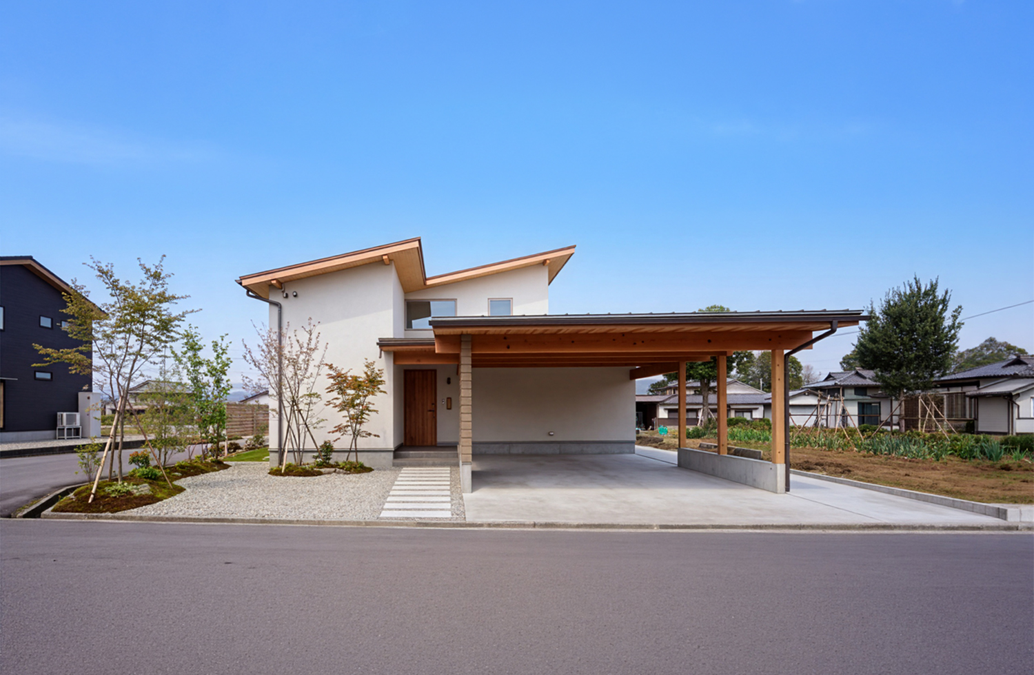 一体型の造作カーポートと、落ち着いた表情の塗り壁が特長的な外観。庭や建物の佇まいが、周囲の静かな住宅街と美しく調和しています。室内は、玄関からパントリー、キッチン、洗面所、ウォークインクローゼット、浴室へとつながる動線と、リビングへ向かう動線の2つを計画。それらをつなぐ回遊動線により、家族の暮らしがスムーズに流れる間取りとなっています。また、ダイニングから続く屋根付きのデッキは、家族で食事を楽しんだり、コーヒーを片手に読書をしたりと、日常に余白をもたらす空間になっています。リビングには畳コーナーを設け、庭の植栽を眺めながらゆったりと過ごせる空間になりました。2階には、カウンターを備えたスキップフロアや、吹き抜けを活かしたブリッジを配置。緻密な構造計算に基づいて耐震性能を確保しながら、吹き抜けのもつ開放感を最大限に引き出しています。どこにいても家族の気配を感じながら、それぞれがゆったりと過ごせる住まいです。さらに当日は、宇宙開発技術から生まれた次世代浄水システム「WACOMS」の試飲会も同時開催いたします。