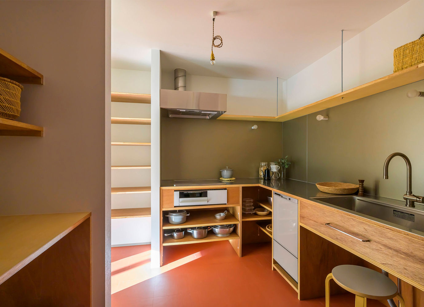 下部には出し入れしやすいオープン収納を設け、背面には造作カウンターで家電や食器をすっきり収納。料理も片付けも効率よく行えるキッチ